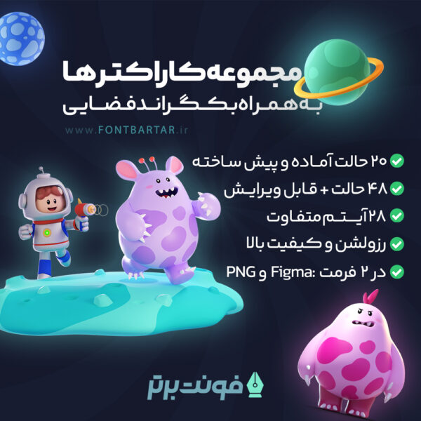 فایل کاراکترهای فضایی با دو فرمت PNG و FIGMA از محبوب ترین فرمت های مورد استفاده در کارهای طراحی می باشد، ساختار کاراکتر های فضایی به همراه بکگراند های فضایی به شکلی است که شما می توانید طرح فضایی بدون پس زمینه را ذخیره کنید و در موارد مختلف از آن استفاده کنید. این امکان دست شما را برای طراحی فضایی باز گذاشته و فایلی با حجم کمتر اما با کیفیت بالا خواهید داشت.